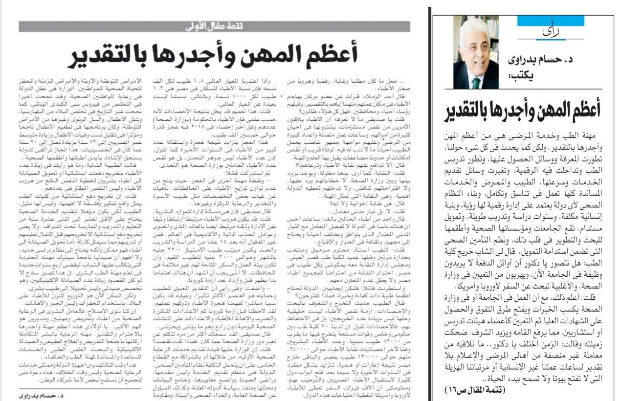 إن كنا ننوى الإصلاح، فالعامل البشرى فى الرعاية الصحية من أطباء وتمريض ومهنيين ومديرين هو الهم الأكبر. يا أولادى هذه أعظم مهنة وأجدرها بالاحترام والتقدير. مهنه الرعاية بالبشر المتكاملة أركانها بأجنحة التمريض والعلاج الطبيعى والصيدلة الإكلينيكية والبحث العلمى الطبى والخدمات المساعدة والمساندة لمهنة الطب والحكماء..