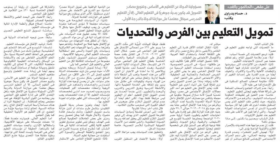 إن مسؤولية الدولة عن التعليم هى الأساس، وتنويع مصادر التمويل قد يكون بديلًا جوهريًا فى التعليم العالى، إلا أن التعليم المدرسى سيظل معتمدًا على موازنة الدولة بالدرجة الأولى، المسؤولة دستوريًا عن الإنفاق عليه. ولعل التحدى الأكبر فى إدارة التعليم قبل الجامعى، بمَن يحتاجه من القوى البشرية المؤهَّلة، هو تحدٍّ مجتمعى يحتاج للمناقشة.. إن الحقيقة المُرة أن هناك مساحة واسعة لترشيد الإنفاق المتاح، رغم ضآلته النسبية، تحتاج إرادة سياسية مؤيَّدة من المجتمع، إن كان التعليم هو الأولوية الحقيقية كما يقول المجتمع.