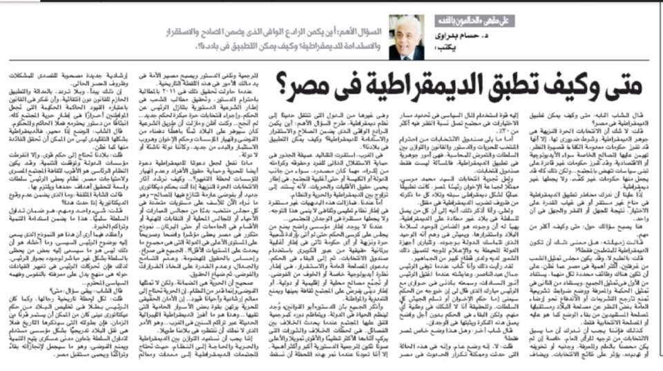 ولعل تجربة انتخابات السيد محمد مرسى، ممثلًا لجماعة الإخوان رئيسًا لمصر، كانت تطبيقًا عمليًا لشكل ديمقراطى سبقه وتلاه كل ما ذكرته من ظروف تضرب الديمقراطية فى مقتل.