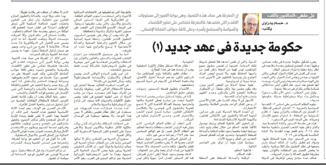 يجئ تشكيل حكومة جديدة في فترة رئاسية أخيرة للرئيس في وقت حساس ، وعليها اعداد المجتمع لمستقبل محددة ملامحة في اطار رؤية معلنة واحترام لدستور. البلاد.