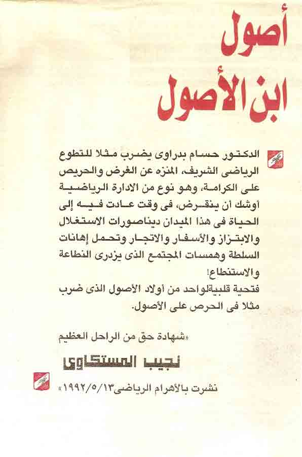 د.حسام بدراوي يضرب مثلا للتطوع الرياضي الشريف ، المنزه عن الغرض والحريص علي الكرامة ،وهو نوع من الادارة الرياضية أوشك أن ينقرض، في قوت عادت فيه الى الحياة في هذا الميدان ديناصورات الاستغلال والابتزاز والأسفار والاتجار وتحمل اهانات السلطة وهمسات المجتمع الذي يزدري النطاعة والاستنطاع، فتحية قلبية لواحد من أبناء الأصول الذي ضرب مثلا في الحرص على الأصول