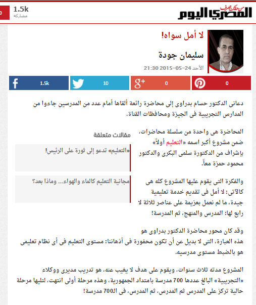 دعانى الدكتور حسام بدراوى إلى محاضرة رائعة ألقاها أمام عدد من المدرسين جاءوا من المدارس التجريبية فى الجيزة ومحافظات القناة.