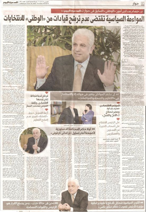■ الدستور لم يراعِ ثقافة الشعب وما هو قائم منذ سنوات، نظام الحكم الحقيقى فى مصر رئاسى بالممارسة، حتى وإن كان مختلطاً فى الدستور، وهذه هى الإشكالية التى وضعنا فيها، حيث اعتمد الدستور الحالى على النظام الحزبى، ونحن نعلم أن الأحزاب الحالية لا تمثل أى ثقل مجتمعى، كما أقر الدستور النظام الرئاسى البرلمانى فى الحكم الذى يعتمد على اقتسام السلطة بين الرئيس والحكومة التى تمثل الأغلبية البرلمانية رغم أن الجميع يعلم أن ثقافه الشعب مازالت رئاسية،