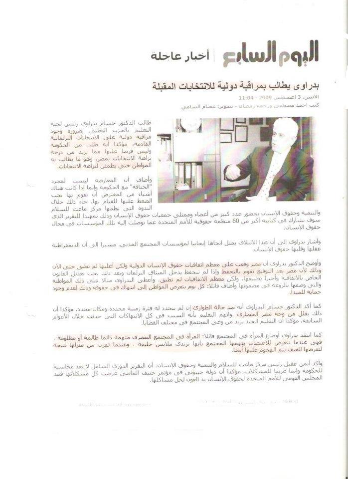 طالب الدكتور حسام بدراوى رئيس لجنة التعليم بالحزب الوطنى بضرورة وجود مراقبة دولية على الانتخابات البرلمانية القادمة، مؤكدا أنه طلب من الحكومة وليس فرضا عليها مما يزيد من درجة نزاهة الانتخابات بمصر، وهو ما يطالب به المواطن حتى يطمئن لنزاهة الانتخابات.