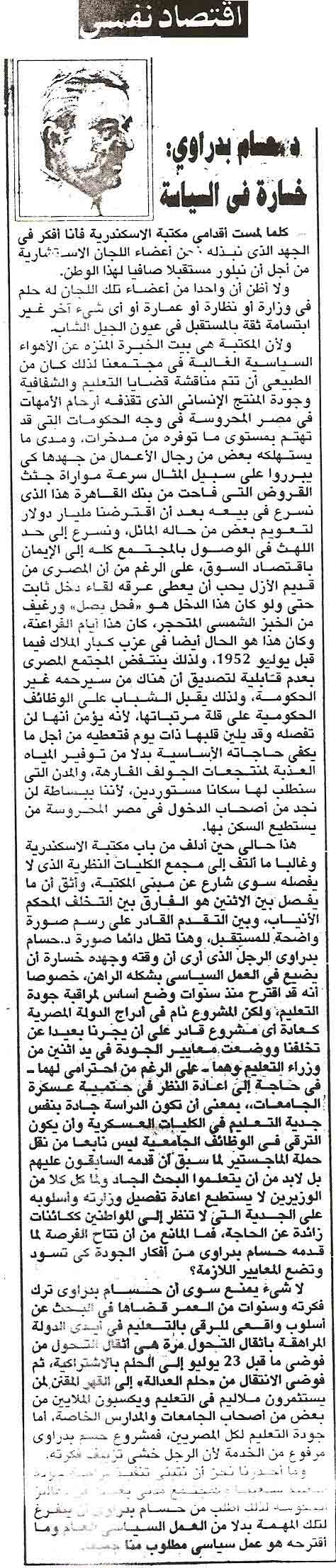 حسام بدراوى .. خسارة فى السياسة .. صحيفة العالم اليوم