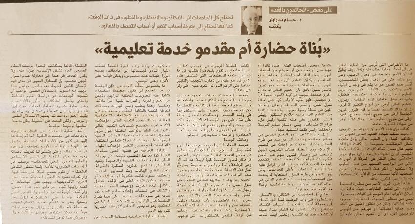 Few of the intellectuals see higher education from a different perspective, and here comes their role in asking the question and repeating the talk about its answer in society, the media, and among faculty members, many of whom have over time entrenched the idea of performing the duty as a public employee, and providing the educational service as it is in the approved course. It is approved by the Ministry or the Supreme Council of Universities. The role of enlightenment in asking the question comes in response to what is happening in universities and institutions of higher education in the whole world: Are we educational service providers or builders of modernity and makers of civilization?