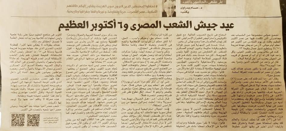 I add to this important speech that whoever lived and remembers October 73, he must now be over fifty years old, and teaching the October War in education curricula must be based on a scientific vision and not rhetorical judgments with bids that make students not believe the facts after that.