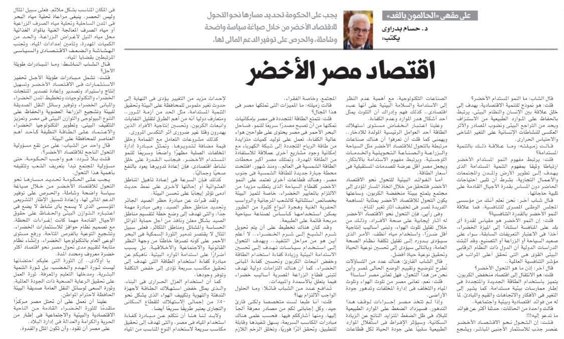 I said: Long-term initiatives include stimulating investments in the green economy, facilitating the production, import, export and re-export of green products and technologies, planning green cities and green buildings, providing environmentally friendly means of transportation, encouraging organic agriculture, preserving biological diversity and ecological balance in Egypt, promoting environmental education, developing green technology and relying on Clean energy is one of the most important elements for preserving the environment.