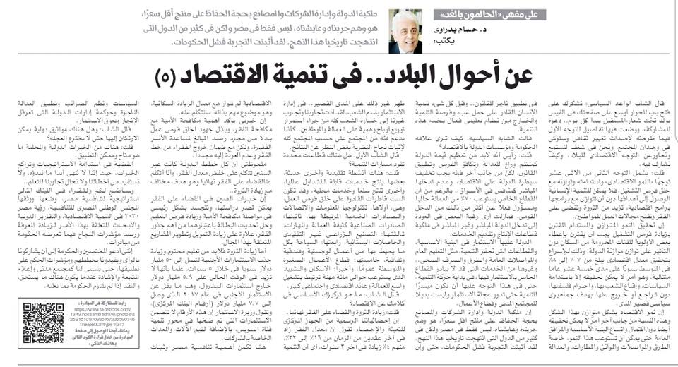 I said: My opinion is that the value of the state must be maximized as an organizer and sponsor of justice, equal opportunities and law enforcement, but on the other hand, the state’s control over the economy must be eased, and it should not interfere directly as a competitor in the markets… although the private sector currently absorbs 70% of the workforce and is actually responsible. About more than that of the national income, I still see the desire of some to return to direct and indirect state intervention in the ownership of the production and service sectors.