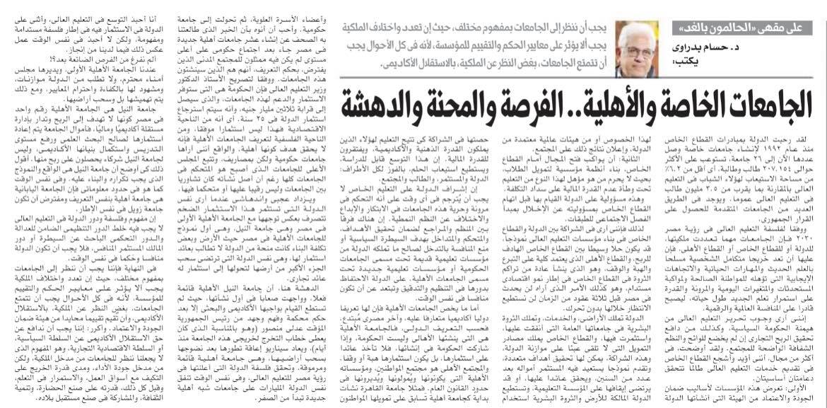 Therefore, I see the partnership between the state and the private sector in building higher education institutions as a model, which may be a mediating solution between the profit-oriented private sector and the private sector, which depends entirely on donation, endowment and endowment, which usually arises from the accumulation of wealth in the private sector within the framework of economic growth Sustainable, which is what I see as it will not happen in Egypt three decades ago, during which we will not be able to wait without action.
