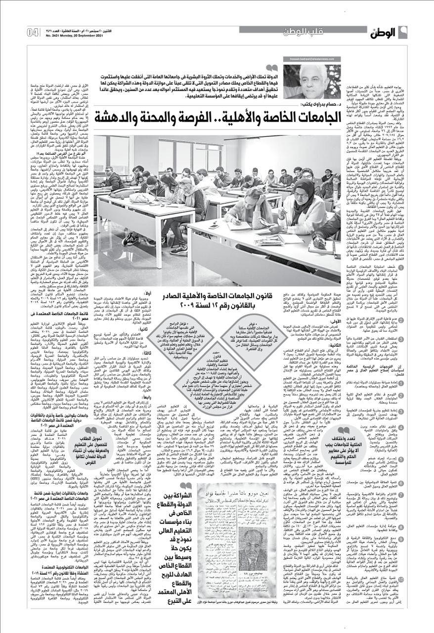Therefore, I see the partnership between the state and the private sector in building higher education institutions as a model, which may be a mediating solution between the profit-oriented private sector and the private sector, which depends entirely on donation, endowment and endowment, which usually arises from the accumulation of wealth in the private sector within the framework of economic growth Sustainable, which is what I see as it will not happen in Egypt three decades ago, during which we will not be able to wait without action.