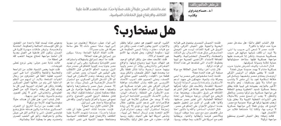 I said: It is no secret to you that Turkish President Erdogan is hostile to Egypt and its people, and hopes for an Islamic caliphate that will take us back to a past that is not commensurate with our hopes and not befitting our future.. It is with the recent trend of having his armies in Libya, which creates a very dangerous military situation and puts the region in a military confrontation between Turkey and Egypt. With reason and logic, Egypt should not allow the seizure of Libyan oil wealth or the creation of a hotbed of terrorism fueled by Turkey in a border country with Egypt. The situation may actually lead to a military confrontation that we do not welcome, but if we engage in it, we must win it.