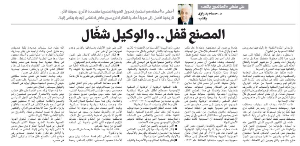 The story came to my mind when you asked me about the impact of what is happening in Saudi Arabia on Egypt, because my fear is that the Salafiya factory will close its doors in the Kingdom, and the agent will continue to “work” in Egypt.