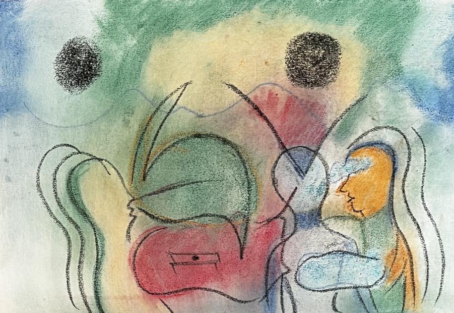 As for the fourth aspect of the painting, it was revealed to me when I felt that the people around me were in intensive care. In my mind, they had only two dimensions, as if I were living inside a cartoon movie, and I did not return to the three-dimensionality except when my daughter, son, wife, or sister held my hand or touched one of them. My granddaughters are on my head or hugging my legs, as if physical contact brings me back from a two-dimensional world that my mind creates to a three-dimensional reality that the touch of a hand or a hug brings back to the reality of life.