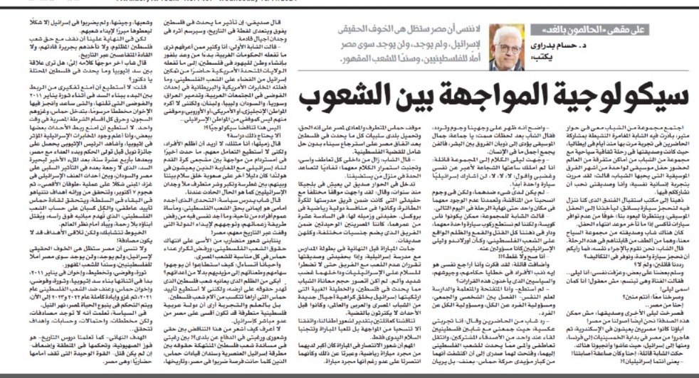 One of my friends, who has lived in Belgium for years, shared a different story. His granddaughter was part of a school volleyball team participating in an international tournament. She and her Egyptian friend were the only Egyptians on the team, which was made up of various nationalities. The semi-final match was against an Israeli school team , and my granddaughter and her friend initially decided not to play to avoid shaking hands with the Israeli players. The families discussed this and ultimately encouraged the girls to play without making physical contact.